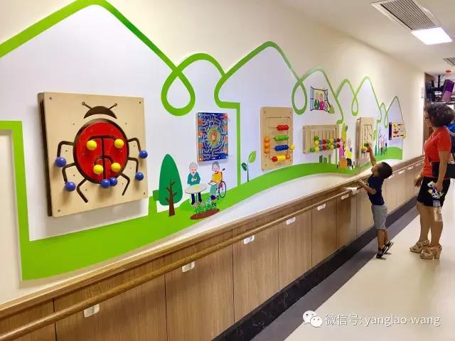 別的機構一般用一個房間來擺放的的健身益腦器具一反常態(tài)掛在墻上,失智長輩和輪椅長輩過往都可以使用,既節(jié)省了空間,又裝飾了墻壁