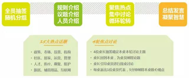 “世界咖啡”養(yǎng)老圓桌論壇,由養(yǎng)老產(chǎn)業(yè)資深專家烏丹星與養(yǎng)老產(chǎn)業(yè)平臺搭建者周明明共同發(fā)起,每期聚焦“養(yǎng)老產(chǎn)業(yè)”內(nèi)的一個熱點(diǎn)、痛點(diǎn)話題,下設(shè)數(shù)個分議題,一改以往“你講我聽”的被動會議方式,邀請專家、政府相關(guān)部門負(fù)責(zé)人以及資深從業(yè)人員作為各議題桌長,在其帶領(lǐng)下,根據(jù)每桌不同議題,在有限的時間內(nèi),在積極主動友好的討論氛圍中,要求參會者充分發(fā)表意見。參與者各桌循環(huán)輪換,最后桌長歸納、分享,主持人提煉、總結(jié),最終集結(jié)成冊與大家共享。