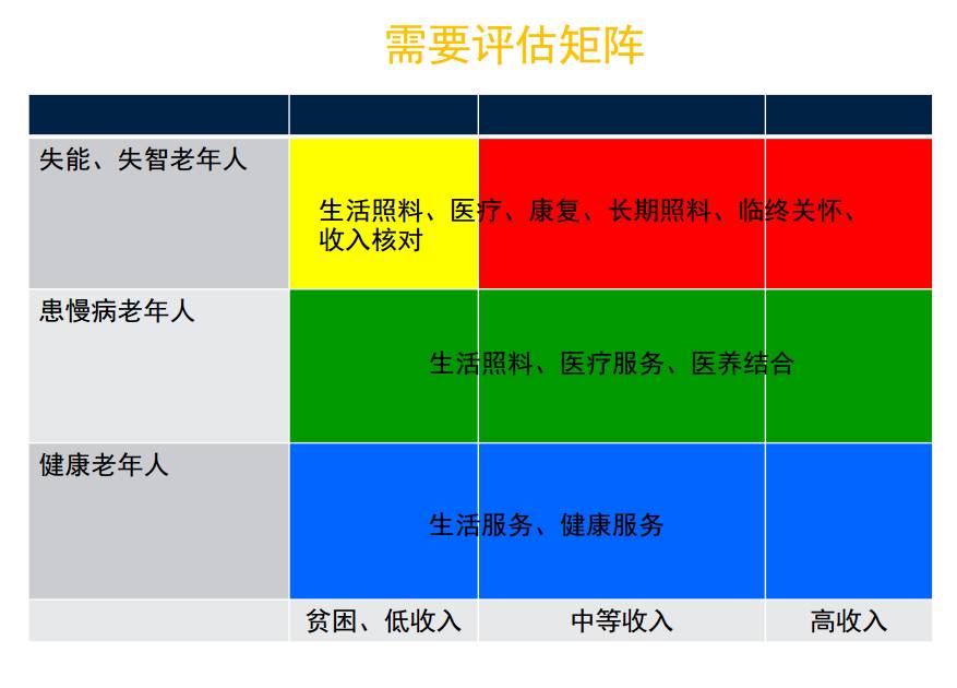 在這種情況下,實(shí)際上有這一系列的關(guān)于信息的支撐,包括數(shù)據(jù)的收集、應(yīng)用和開發(fā),實(shí)際上有一系列的手段。這也是我剛才想講的,我們講需要評(píng)估這個(gè)工作不單純就是一個(gè)量表,不單純是做一個(gè)調(diào)查,不是這么回事,是一整套管理的手段和管理的體系。這是我想強(qiáng)調(diào)的。實(shí)際上從國(guó)際上通行做法來講,一般在發(fā)達(dá)國(guó)家來說,這個(gè)矩陣是非常有意思的一件事,我們也可以看一看,像我前面談到的那樣,我們也可以把老年人分成三大類,簡(jiǎn)單的劃分,實(shí)際上跟各個(gè)地方的政策來講,可以劃分成很多類。一個(gè)是健康類的老年人,一個(gè)是慢病的老年人,慢病的老年人基本生活可以自己照料自己,但是有一些比方說糖尿病、冠心病等等之類的慢病管理,等我們老的時(shí)候慢病會(huì)伴隨我們老年的生活,那一塊可能需要的主要是一些健康的管理。可能需要一些日間照料,對(duì)于真正需要幫助失能失智的這幫人,我們看這個(gè)矩陣你就會(huì)發(fā)現(xiàn),實(shí)際上從很多發(fā)達(dá)國(guó)家或者國(guó)際經(jīng)驗(yàn)來做,它是二維信息都會(huì)收集的。