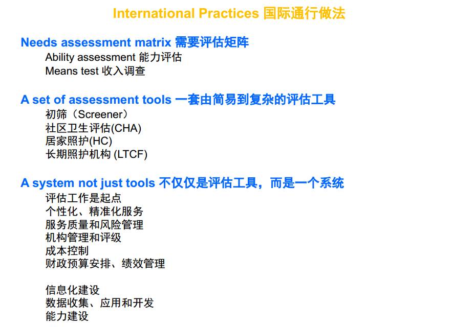 如果從國(guó)際上通行的做法來講,一個(gè)是能力方面,需要評(píng)估的大概兩個(gè)方面的內(nèi)容,一方面是老年人失能、半失能狀況,或者基本的,剛才唐鈞老師講的ADL或者IADL,像InterRAI開發(fā)出更復(fù)雜的,有認(rèn)知的,有身體的狀況,還有視力的狀況。等一下馮老師會(huì)談更多偏向于醫(yī)療那一塊的東西,但是服務(wù)那一塊的東西,實(shí)際上國(guó)際上的經(jīng)驗(yàn)都是包括在這里面的。在國(guó)內(nèi)的做法里面可能更多的偏向于醫(yī)療那一塊,偏向于服務(wù)這一塊不多,今后我們完善這一塊來做,可能我們服務(wù)這一塊要增加考慮這個(gè)內(nèi)容。還有是收入這一塊的調(diào)查,現(xiàn)在我們?cè)趺醋龅礁泳珳?zhǔn)化的服務(wù),我們政府的資金如何更有效幫助這些需要的人們,你沒有收入方面的信息是做不到的。