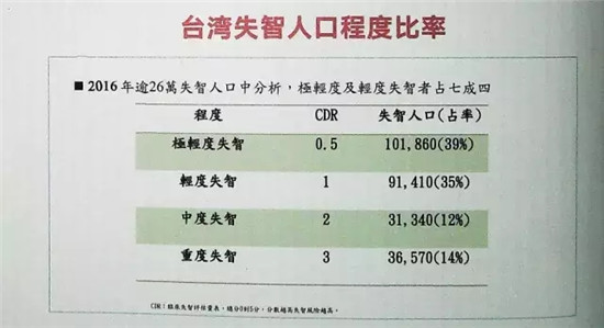 在26萬失智癥人口里面有39%左右,約10萬人屬于極輕度的失智癥患者;輕度患者,也就是CDR(臨床失智評估量表)在1分左右的患者占35%,有9萬多人;中度失智癥和重度失智癥患者加起來共占26%左右,約有6萬7千多人。