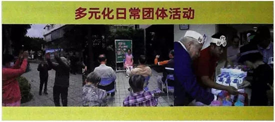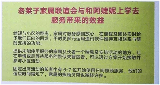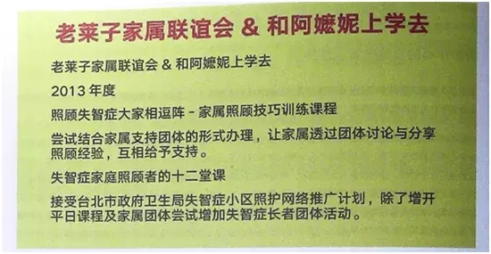 從2013年開始,養(yǎng)護中心進行了一個新的嘗試,辦理老萊子家屬聯(lián)誼會,名字來源于中國24孝老萊子的故事,就是讓在家里照顧失智長輩的家庭能夠使用日間照護中心的空間,老人的活動由日間照護人員提供課程,也對老人的家屬提供支持性的課程。這個老萊子家屬聯(lián)誼會在臺北地區(qū)利用衛(wèi)生局的空間做推廣。另外從2015年開始,配合政府開展小規(guī)模多機能的服務(wù)。