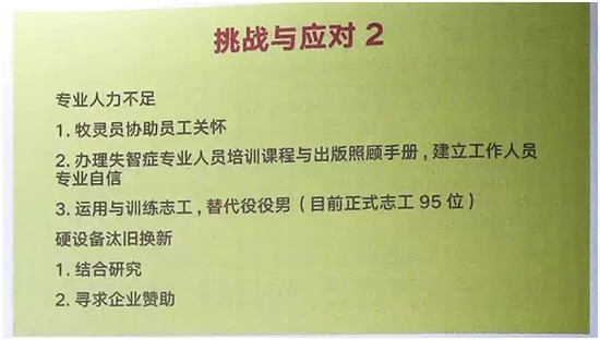 目前對整個機構(gòu)大的挑戰(zhàn)就是運營經(jīng)費。為了解決經(jīng)費問題,中心一方面通過媒體及網(wǎng)絡(luò)宣傳自己,另外也通過各種辦法籌集資金。2010年拍攝了以關(guān)懷失智老人為主題的紀錄片《被遺忘的時光》,并通過部片子獲得了一部分政府補助款,影片上映的時候還有票房收入,通過影片的宣傳,還為基因會募集三千多萬新臺幣的善款,這部分資金可以支持心養(yǎng)護中心未來20年的運營。