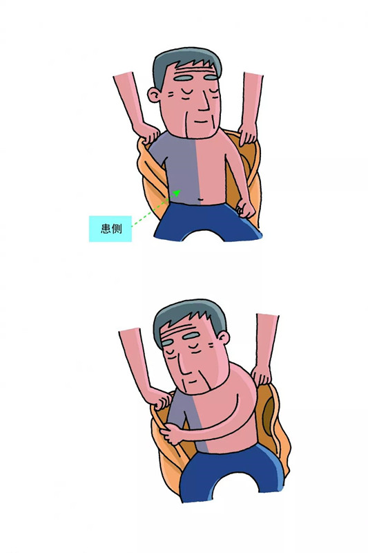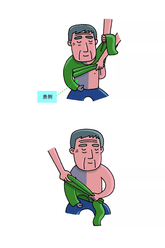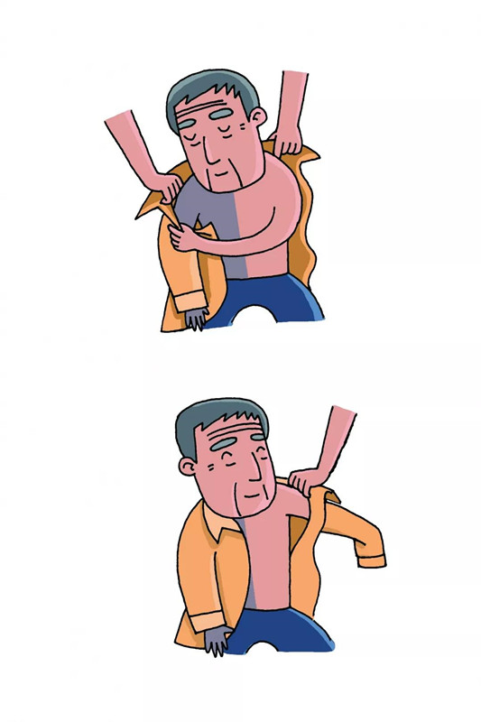 1)將衣服脫到兩側(cè)肩膀處,先將能靈活運(yùn)動(dòng)的一側(cè)(健側(cè))的手臂從袖子中抽出;