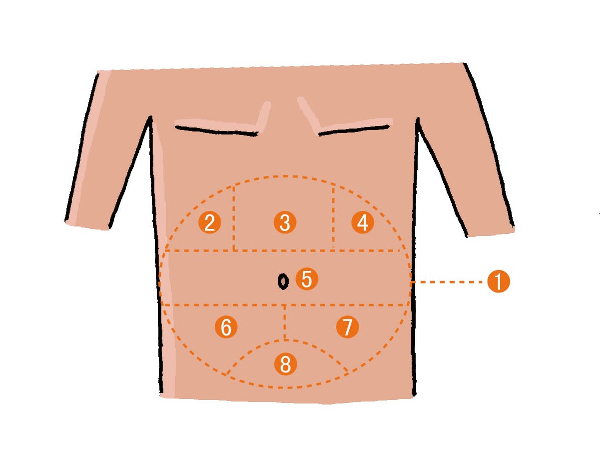 ③中上腹部:食道炎、急性胃炎、胃潰瘍、十二指腸潰、胃癌、急性胰腺炎、心肌梗塞等。