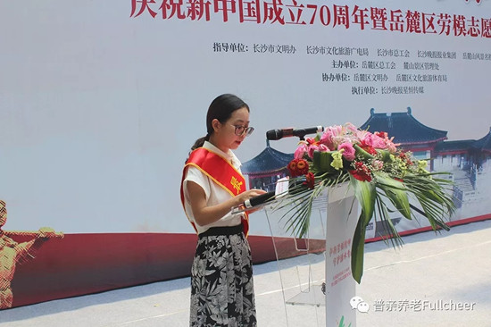 2019年5月24日,由長(zhǎng)沙市岳麓區(qū)總工會(huì)、麓山景區(qū)管理處主辦,岳麓區(qū)文明辦、岳麓區(qū)文化旅游體育局協(xié)辦,長(zhǎng)沙晚報(bào)星恒傳媒承辦的慶祝新中國(guó)成立70周年暨岳麓區(qū)勞模志愿服務(wù)主題活動(dòng)《弘揚(yáng)勞模精神,守護(hù)綠水青山》在岳麓區(qū)風(fēng)景名勝區(qū)愛晚亭舉辦,普親先鋒社區(qū)老年養(yǎng)護(hù)中心站長(zhǎng)余莉榮獲勞模稱號(hào)并作代表發(fā)言。