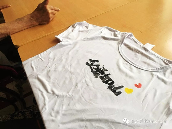 工作人員用胡蘿卜雕刻出了五角星、愛心等各類模具,指導(dǎo)老人挑選自己喜歡的形狀沾上顏料再印上T恤,也有老人匠心獨(dú)運(yùn),利用自己多年的書法功底,用毛筆直接寫下了自己想寫的內(nèi)容。