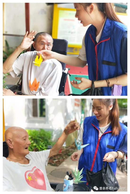 作為最會(huì)舉辦活動(dòng)的機(jī)構(gòu)之一,�?谑衅沼H第一老年養(yǎng)護(hù)院希望在父親節(jié)的時(shí)候,用陪伴來為老人過節(jié)。養(yǎng)護(hù)院的社工小芳同學(xué)聯(lián)系了新青年愛心協(xié)會(huì)、海口工商職業(yè)學(xué)院旅游藝術(shù)學(xué)院的志愿者們,大家為院里過節(jié)的父親們送上手工制作的千紙鶴和紅彤彤的愛心,寄托了他們對(duì)老人們的美好祝愿。
