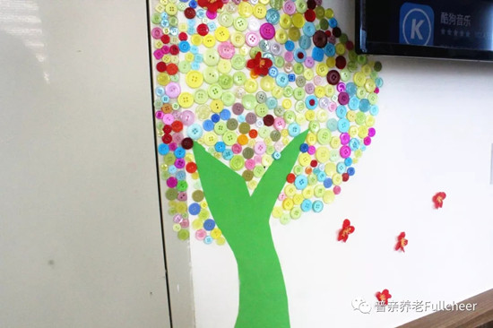 護(hù)理員網(wǎng)購來五顏六色的可愛扣子,帶著老人利用工作之外的閑暇時(shí)間,打造出了一棵五彩繽紛的常青樹。