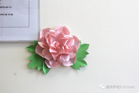 收獲了眾多好評(píng)的藍(lán)色系折紙花,讓單調(diào)的墻面多了浪漫點(diǎn)綴,裝扮了老人們的生活環(huán)境,還被院長選為了“最受喜愛的環(huán)創(chuàng)作品”。