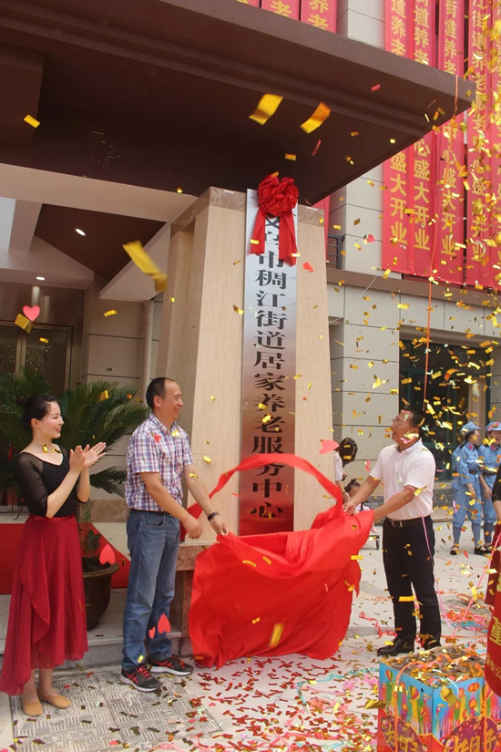 義烏市政府副市長(zhǎng)朱有清、金華市民政局副局長(zhǎng)胡立中、義烏市民政局局長(zhǎng)劉德鈞、稠江街道辦事處書(shū)記江澤陽(yáng)共同為養(yǎng)護(hù)中心揭牌。
