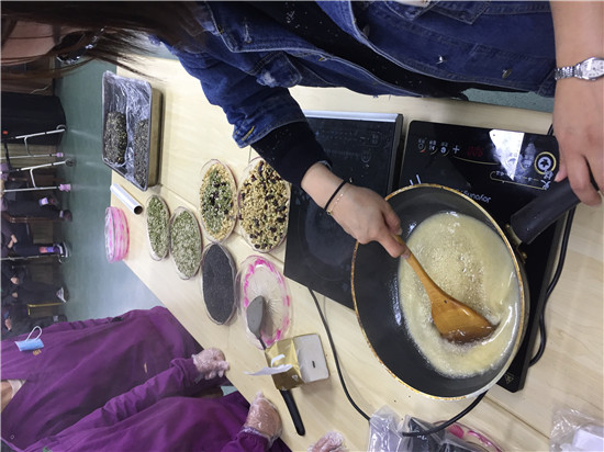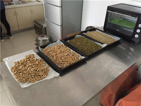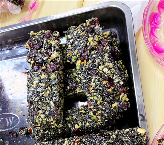 原材料都是工作人員早已準(zhǔn)備好的食材,烤熟的核桃、芝麻、瓜子仁和蔓越莓香氣四溢,熬煮的麥芽糖讓整個(gè)活動大廳都充滿甜蜜的香味。