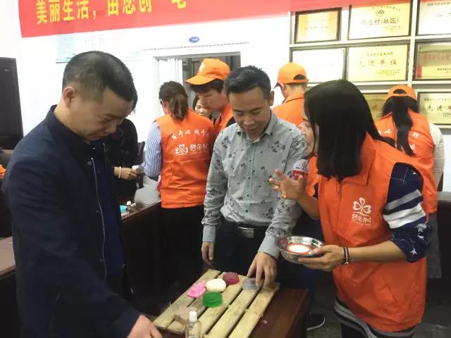 ▲工作人員向街道康騰飛書記介紹手工皂