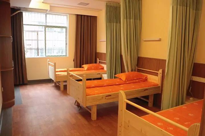 【臥室】暖橙色的四件套,溫馨居家,淺綠色的落地簾很好的保證了私密性,咱們機構(gòu)里的床是專門定制的護理床哦,非常適合老人們的居住使用。