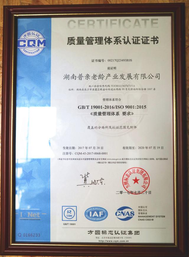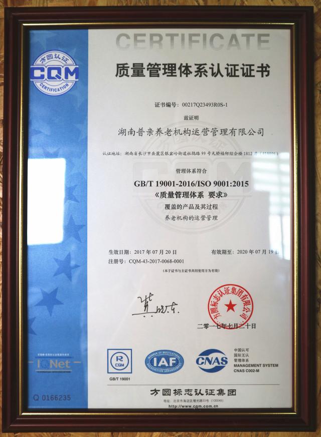 近日,湖南普親養(yǎng)老機構(gòu)運營管理有限公司順序通過ISO9001:2015質(zhì)量管理體系認證,成為養(yǎng)老行業(yè)首批通過新版GB/T19001-2016質(zhì)量認證的企業(yè)。