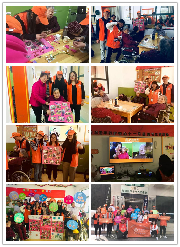 活動以感恩護理員和護士們對老人的照護為主,工作人員們準備了機構每位老人和護理員在園內生活互動的照片,在志愿者的幫助下,邀請老人們加入動手行列,一起做成了感恩照片墻,既美好又意義非凡。
