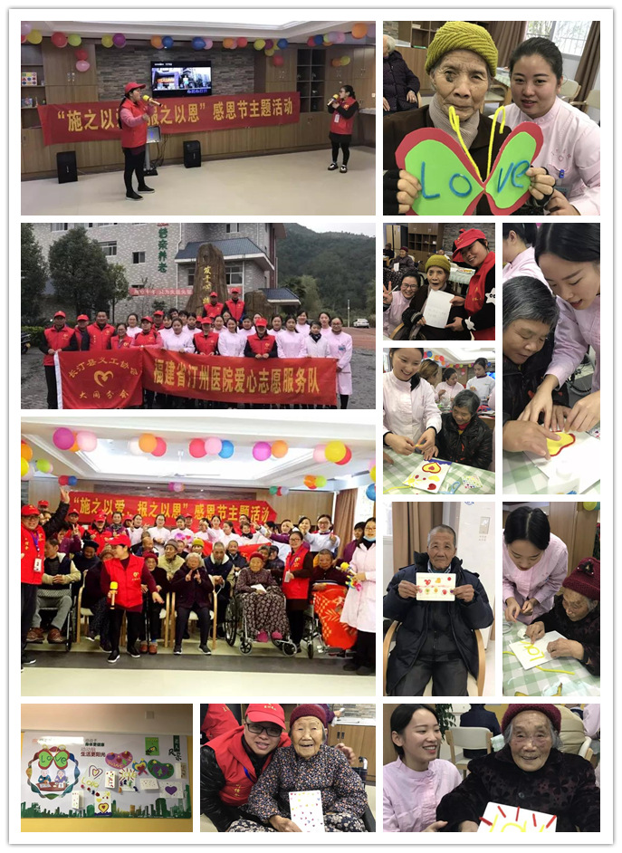 26日上午,咱們位于大美汀州的長汀普親老年養(yǎng)護院也舉辦了感恩節(jié)主題活動,長汀縣義工協(xié)會大同分會和福建省汀州醫(yī)院的護士們也一起參與了活動,陪著老人聊天,與老人們一起制作感恩賀卡,合唱感恩之歌,雖然只有短短的一個上午,大家卻還是一起度過了一段美妙的時光。