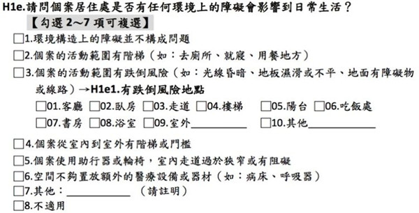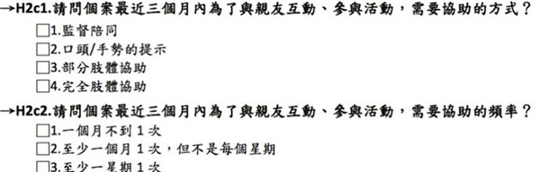 H2的部分是社會(huì)參與,從以前的一題變成三題了,后續(xù)還有提供服務(wù)來(lái)滿足個(gè)案的社會(huì)參與需求。