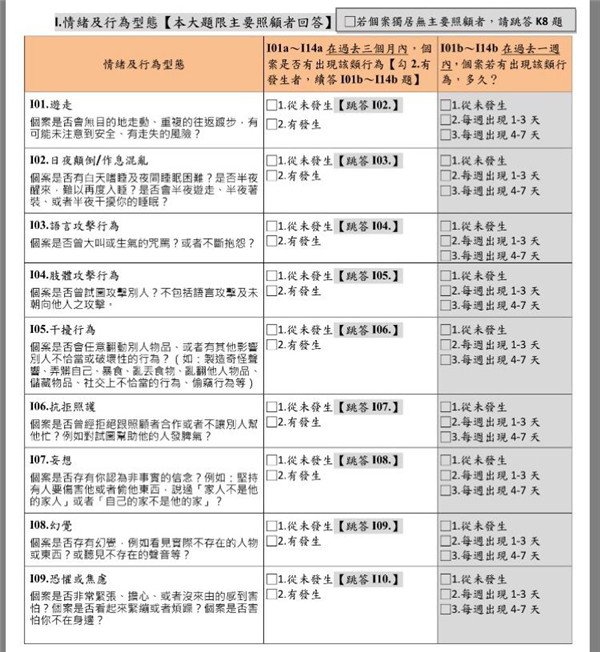 這部分用了一個(gè)新的量表,一共14個(gè)項(xiàng)目,我不知道這量表出自哪里(知道的人可以在下方留言告知),但內(nèi)容看起來(lái)有點(diǎn)像失智癥的精神行為癥狀。