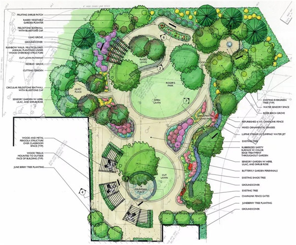 早期規(guī)劃花園時(shí),應(yīng)當(dāng)盡量利用的現(xiàn)有陰影元素,如場(chǎng)地原有喬木和構(gòu)筑物,并為長(zhǎng)者布置座椅和休憩區(qū)域�?紤]到長(zhǎng)期的景觀(guān)效果,可以利用紫藤、凌霄等藤蔓植物結(jié)合構(gòu)筑物,創(chuàng)造遮陰空間的同時(shí),也在地面留下自然的光斑,而不是有壓迫性的濃重的陰影。