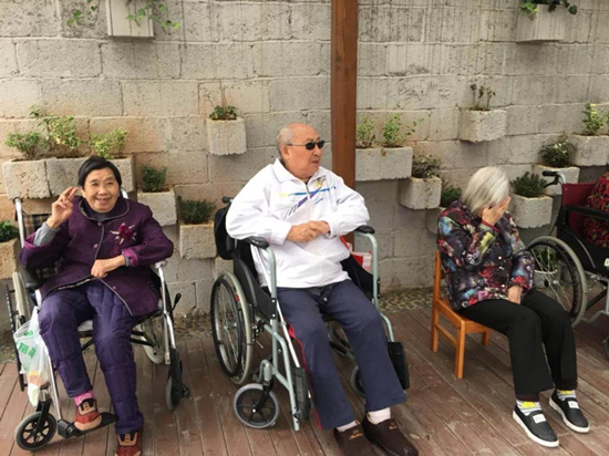 天氣好的時候,護理員會帶爺爺奶奶們會出來曬太陽