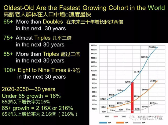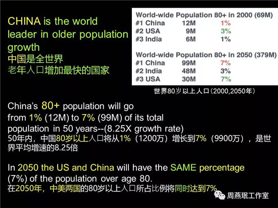 中國80歲以上的老人會從目前的1200萬增加到9900萬,到2050,中國老年人口占全國人口的比例跟美國是一樣的。但是中國的絕對人口數(shù)量是要比美國多幾倍的,美國人認(rèn)為這是非常大的問題,對中國來說,這個挑戰(zhàn)尤為巨大。