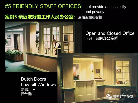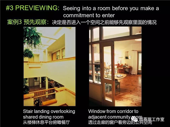 考慮到人們對社會關(guān)系的本能認(rèn)知,進(jìn)入房間之前,如果能夠看到里面的情況,對于人的心理感受會有很好的提升。這兩個案例都是通過窗戶或者是降低扶手的高度的方式,起到在相互交往或者決定交往之前能夠提前預(yù)判的作用。