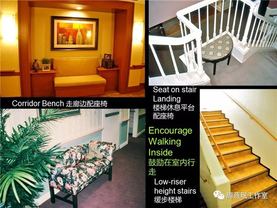鍛煉不光在室外,在室內(nèi)一定要繼續(xù),走廊、樓梯都存在老人鍛煉的機(jī)會。除了座椅是必須設(shè)置的,臺階的高度也一定要控制好,另外踏步之間布置休息平臺也十分必要。總之,鍛煉的理念要從室內(nèi)到室外,貫始至終。