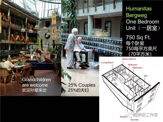 這個項目對老年夫婦還有一個很大的吸引力。如果住到這樣的設(shè)施中,兩個人可能在其中一個身體不太好的時候住進(jìn)來,互相扶持,即使一方過世了,另外一方也可以繼續(xù)住下去。相比于在家里照顧,一方去世另一方再進(jìn)到護(hù)理院的方式要好得多。這個對老人的吸引力非常大,所以里面有25%的入住者都是夫婦。