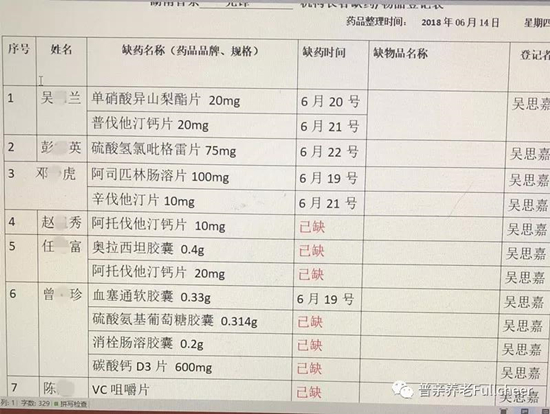 ▲▲▲這是普親養(yǎng)老某機(jī)構(gòu)6月某周的老人缺藥清單。