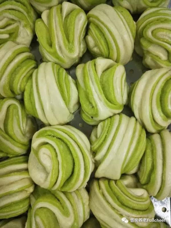 ▲光喝白粥不頂餓,廚房大師傅現(xiàn)做的花卷了解一下?綠白相間的顏色,香味都快溢出屏幕了,看著就想咬一口。