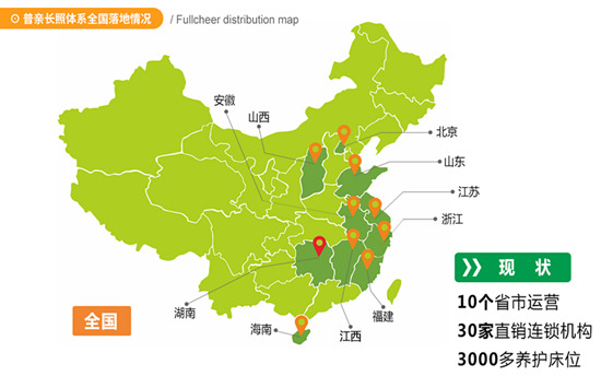 十年里,普親養(yǎng)老從海南開始,一路向北,在湖南扎根,又陸續(xù)向江西、福建、浙江、安徽、江蘇、山東、北京等省市挺進,到目前已實現(xiàn)了10個省市運營,30家直營連鎖機構(gòu),3000多養(yǎng)護床位的連鎖版圖目標(biāo)。
