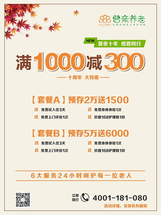 普親養(yǎng)老的十年,離不開每一位可愛的老人和每一個給予信任的家庭,為了回饋大家,普親養(yǎng)老策劃了本次以“感恩”為主題的十周年大特惠活動,除了繳費享減免的優(yōu)惠活動外,還能收到我們準(zhǔn)備的活動大禮包,試入住、全面體檢、上門評估、老年專用護理鞋通通免費送給你!