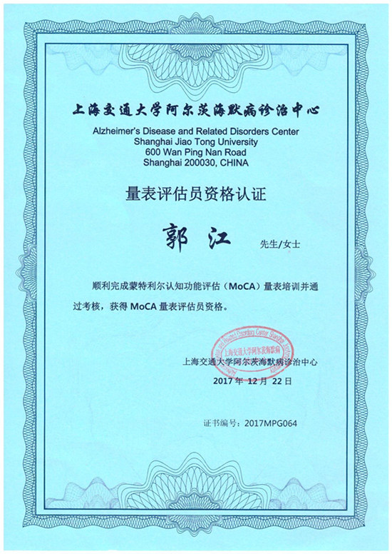 湖南普親老齡產(chǎn)業(yè)發(fā)展有限公司心理咨詢師郭江女士,完成蒙特利爾認知功能評估(MoCA)量表培訓(xùn),并通過考核,獲得MoCA量表評估員資格。