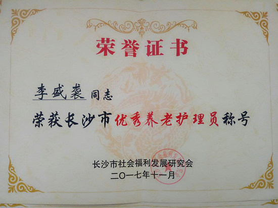 長(zhǎng)沙普親老年養(yǎng)護(hù)院護(hù)理組長(zhǎng)李盛襲女士,榮獲長(zhǎng)沙市優(yōu)秀養(yǎng)老護(hù)理員稱號(hào)。