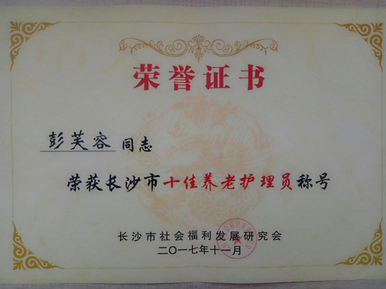 長沙普親老年養(yǎng)護院院長彭芙蓉女士,榮獲長沙市十佳養(yǎng)老護理員稱號。